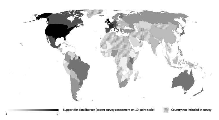 In writing this chapter, we have focused on documented data literacy efforts; however, it is important to recognise that efforts are currently underway around the world, and the Open Data Barometer’s (ODB) visualisation of support for use helps make sense of the status of data literacy at a global scale. The ODB asks “To what extent is training about open data available for individuals or businesses who want to increase their technical skills or develop businesses to use (open) data?” In Figure 3, the map used to visualise results indicates scores between 0 (no training available) to 10 (widespread access to high-quality training).